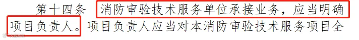 第十四条 消防审验技术服务单位承接业务,应当明确项目负责人。项目负责人应当对本消防审验技术服务项目全面负责。