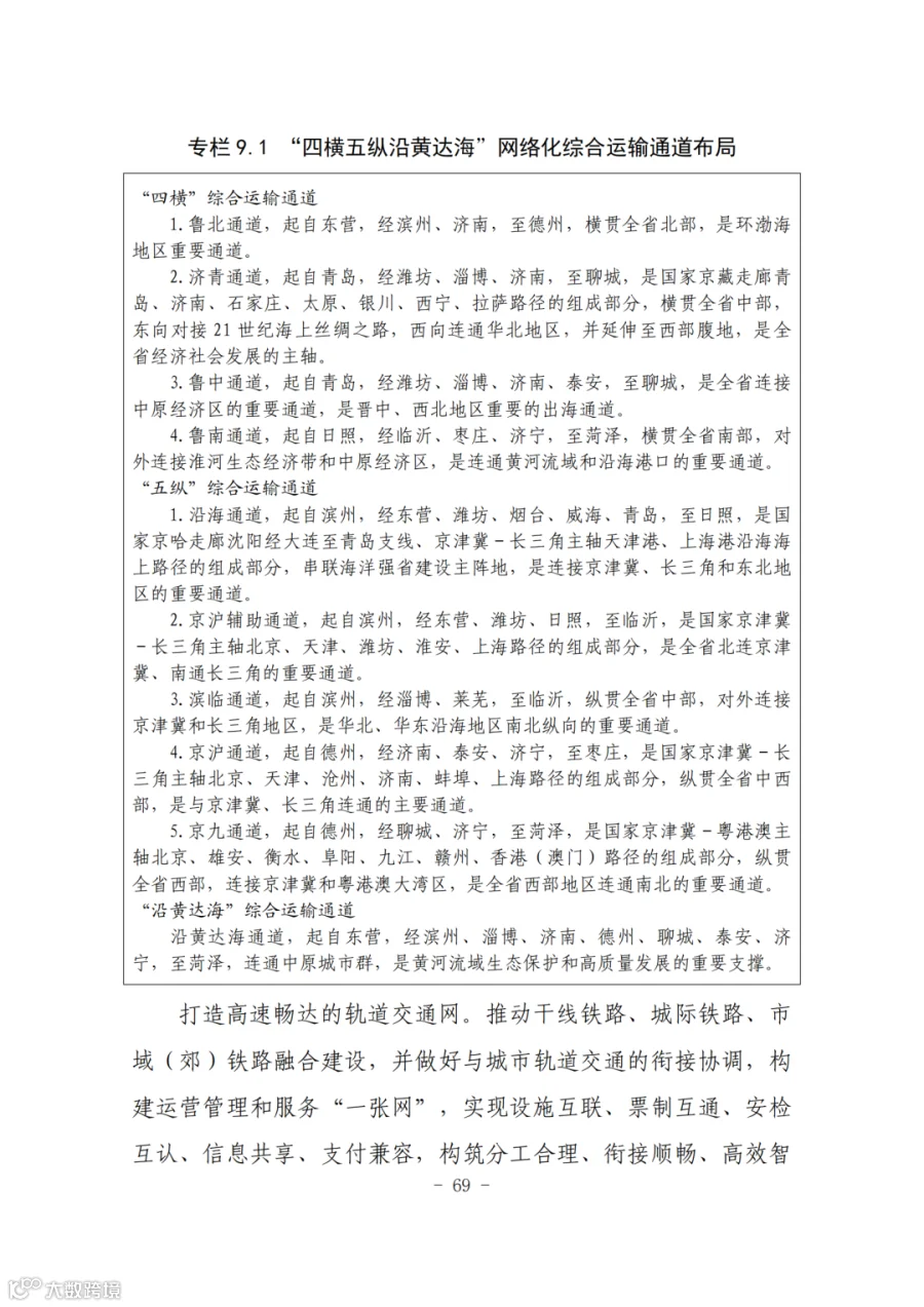 4.鲁南通道,起自日照,经临沂、枣庄、济宁,至菏泽,横贯全省南部,对外连接淮河生态经济带和中原经济区,是连通黄河流域和沿海港口的重要通道。“