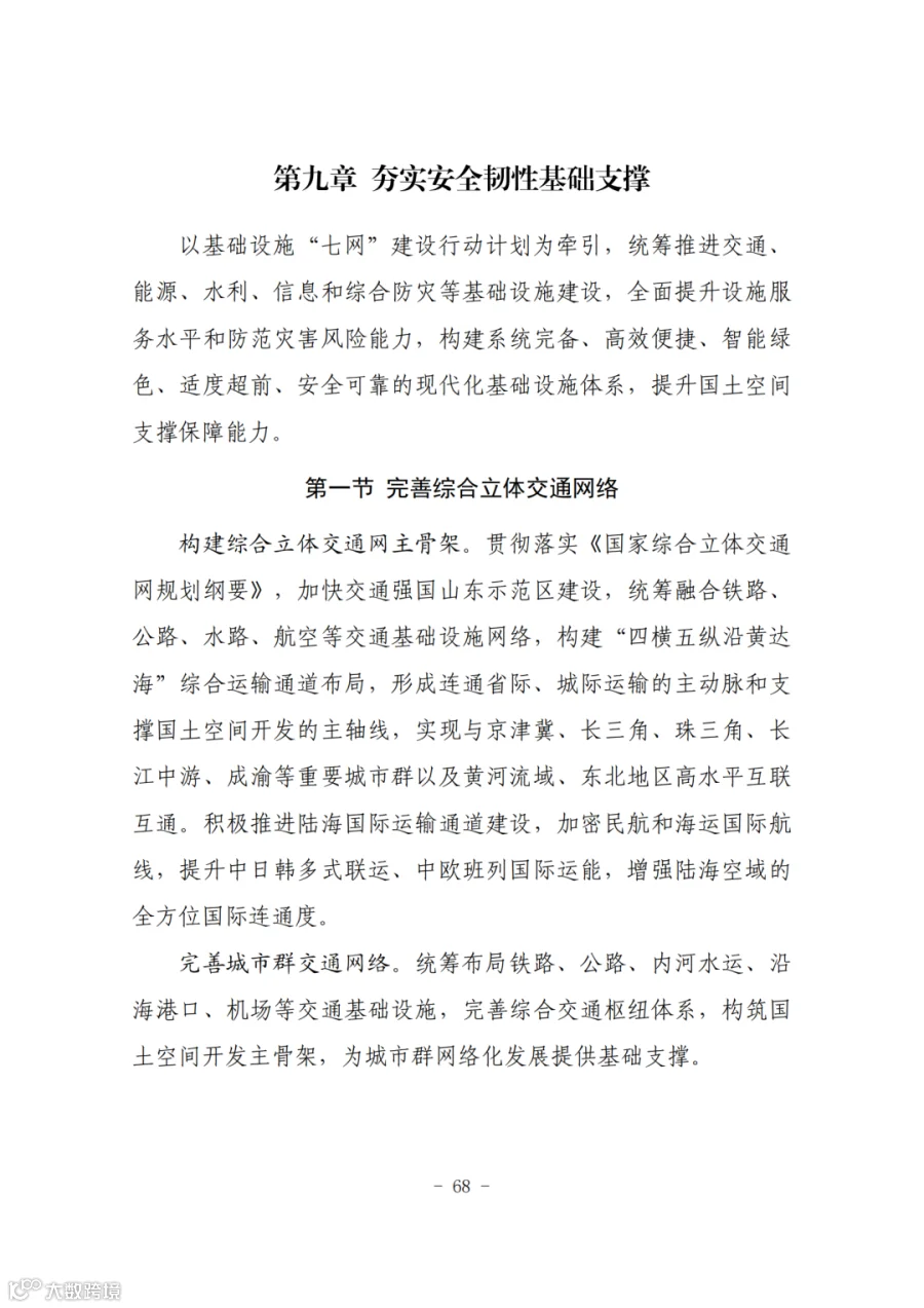 构建综合立体交通网主骨架。贯彻落实《国家综合立体交通网规划纲要》,加快交通强国山东示范区建设,统筹融合铁路、公路、水路、航空等交通基础设施网络。