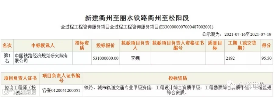 通过上图可以看到,该项目是新建衢州至丽水铁路衢州至松阳段全过程工程咨询服务;中标单位:中国铁路经济规划研究院有限公司;中标价:5.3亿;