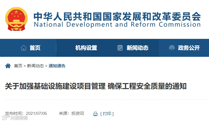 昨天(7月6日),国家发改委发布《关于加强基础设施建设项目管理确保工程安全质量的通知》,本通知自印发之日起施行。