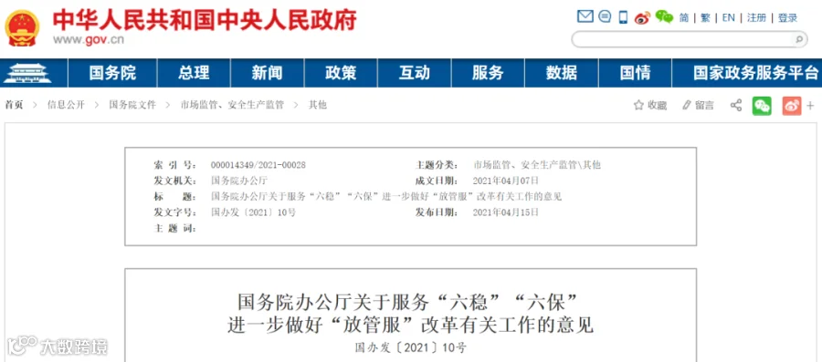 国务院办公厅发布《关于服务“六稳”“六保”进一步做好“放管服”改革有关工作的意见》,明确提出: