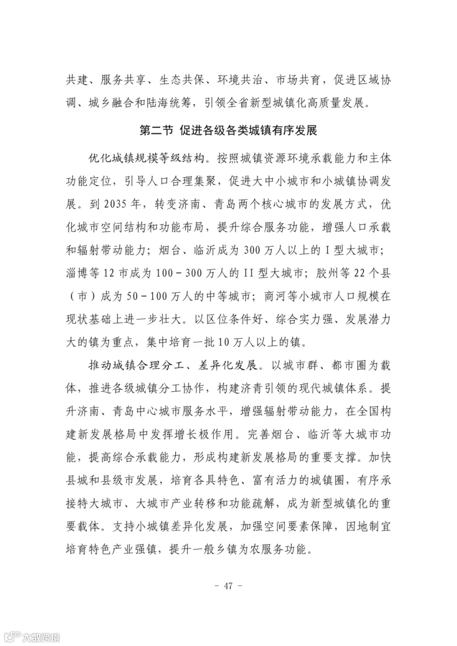 以济南、青岛为核心,建成具有全球影响力的山东半岛城市群,形成“一群双核”城镇空间布局。