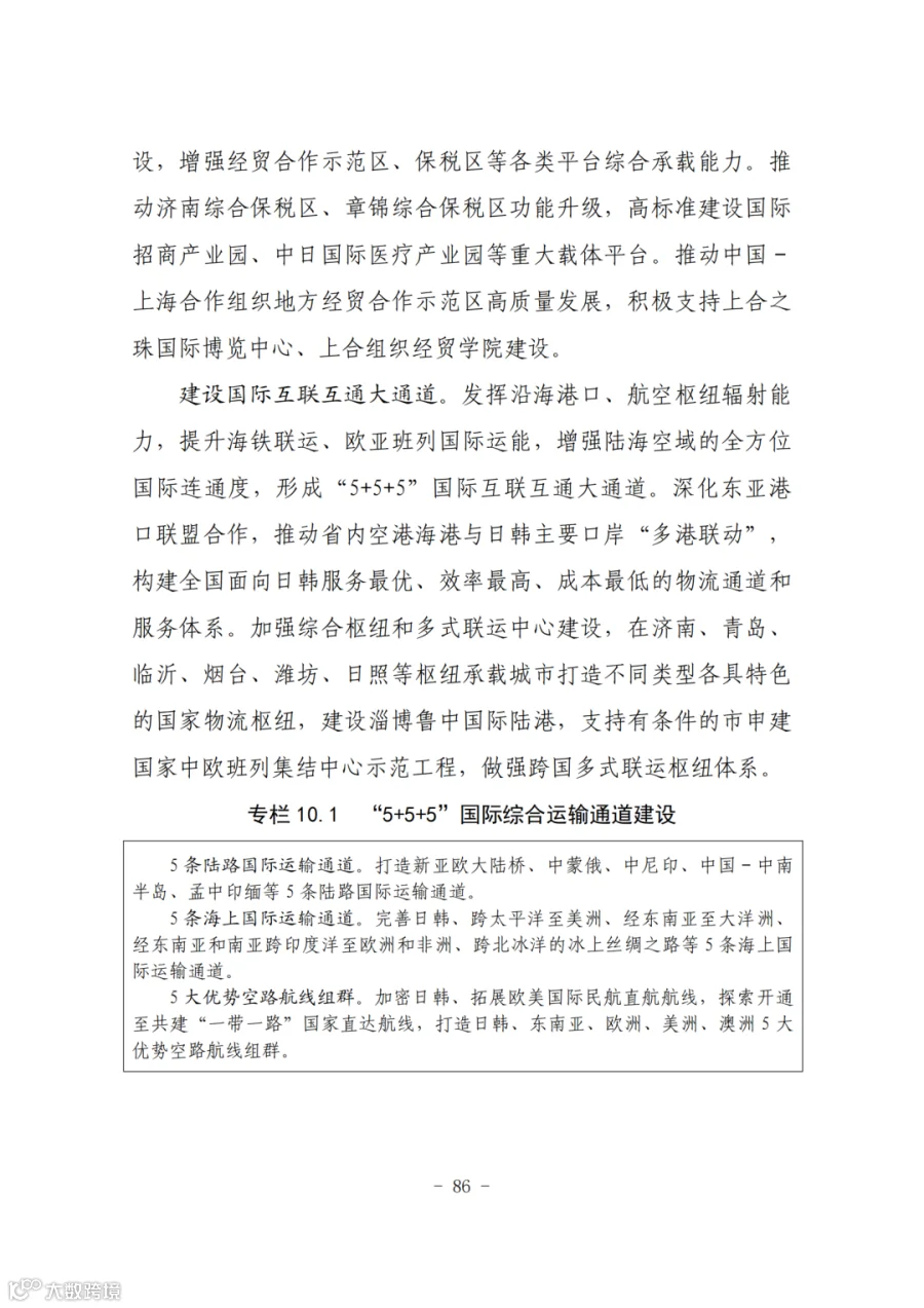 4.鲁南通道,起自日照,经临沂、枣庄、济宁,至菏泽,横贯全省南部,对外连接淮河生态经济带和中原经济区,是连通黄河流域和沿海港口的重要通道。“