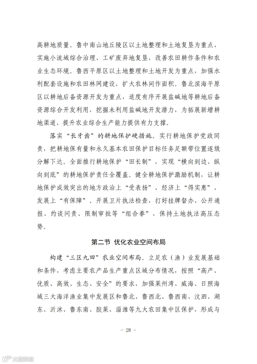 建设莱州湾、威海、日照海域三大海洋渔业集中发展区,重点保护鲁北、鲁西北、鲁西南、汶泗、湖东、沂沭、鲁东南、胶莱、淄潍九大农田集中区,打造“三区九田”农业空间布局,持续增强粮食和重要农产品供给保障能力,牢牢把住粮食安全主动权,扛牢农业大省的责任。