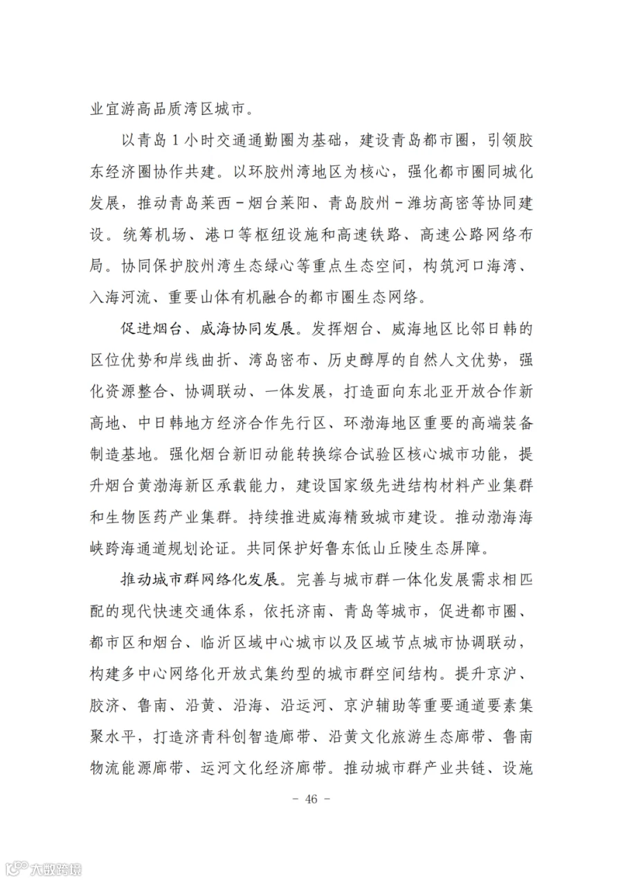 加快构建“一群两心三圈”区域布局,以济南、青岛为省域双中心,以烟台、临沂等大城市为区域副中心,推动形成多中心、网络化的城市群结构。