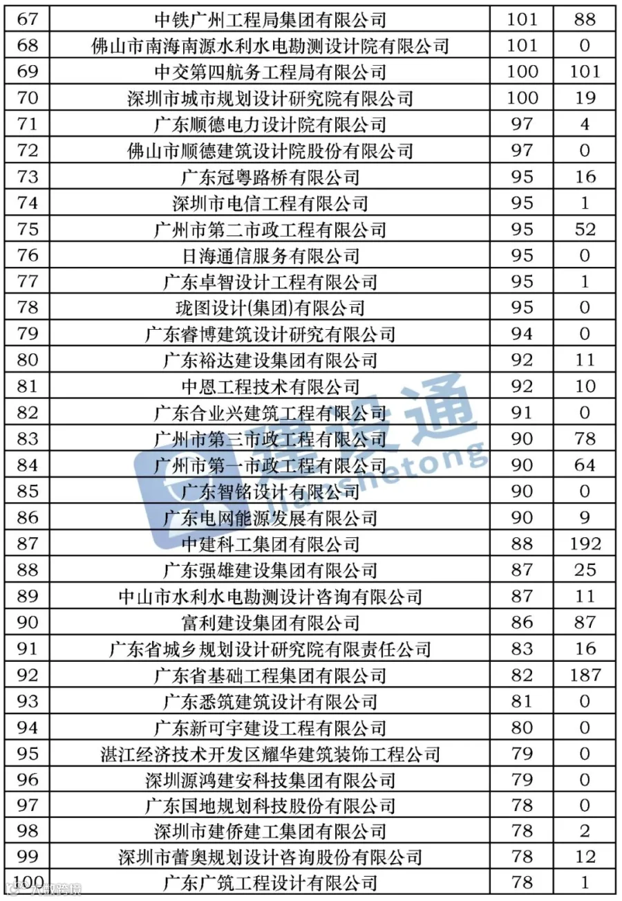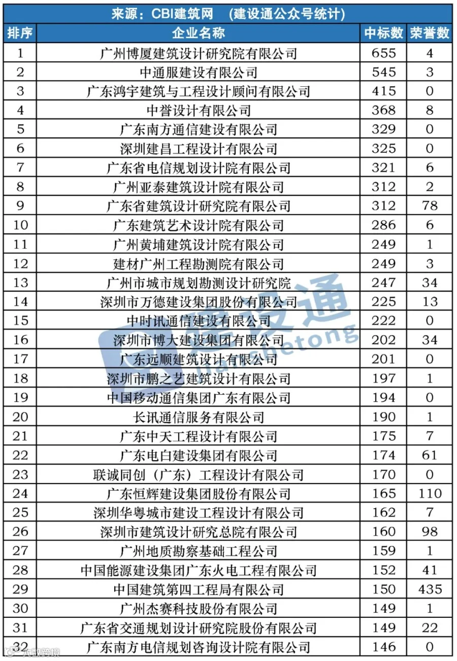 CBI建筑网综合报道:在2020年,广东建筑施工企业中标数量达77020项,同比(与去年同期)上升66.38%。其中,广州博厦建筑设计研究院有限公司、中通服建设有限公司、广东鸿宇建筑与工程设计顾问有限公司分列中标数量排行榜前三位。