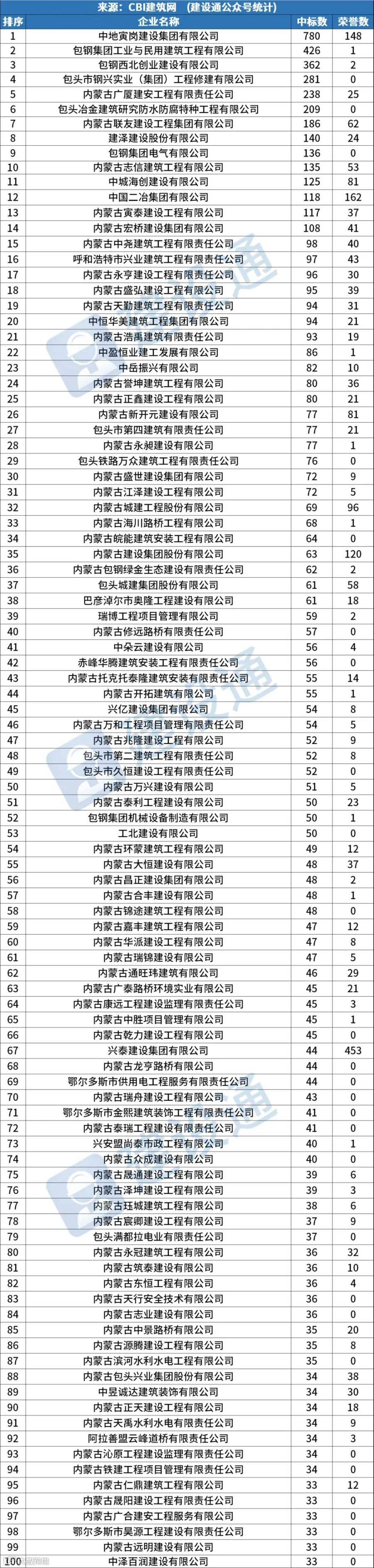 CBI建筑网综合报道:在2023年,内蒙古建筑施工企业中标数量达50244项,同比(与去年同期)上升20.54%。其中,中地寅岗建设集团有限公司、包钢集团工业与民用建筑工程有限公司、包钢西北创业建设有限公司分列中标数量排行榜前三位。