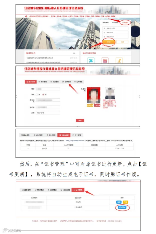 3、换发电子证书。登录住建部“住房和城乡建设行业从业人员培训管理信息系统”按提示进行操作,系统将自动完成“电子证书”换发。