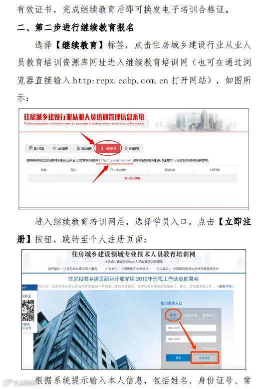 2、参加继续教育。登录住建部“住房和城乡建设行业从业人员教育培训资源库”(http://rcpx.cabp.com.cn)或“住房和城乡建设行业从业人员管理信息系统”→“教育培训资源库”栏目参加继续教育。