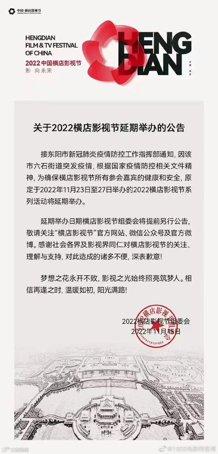 11月15日,2022横店影视节官方发布延期举办公告。公告表示,因疫情原因,原定于2022年11月23日至27日举办的2022横店影视节系列活动将延期举办,原定11月26日举办的第九届文荣奖也随之延期,新的举办日期待定。