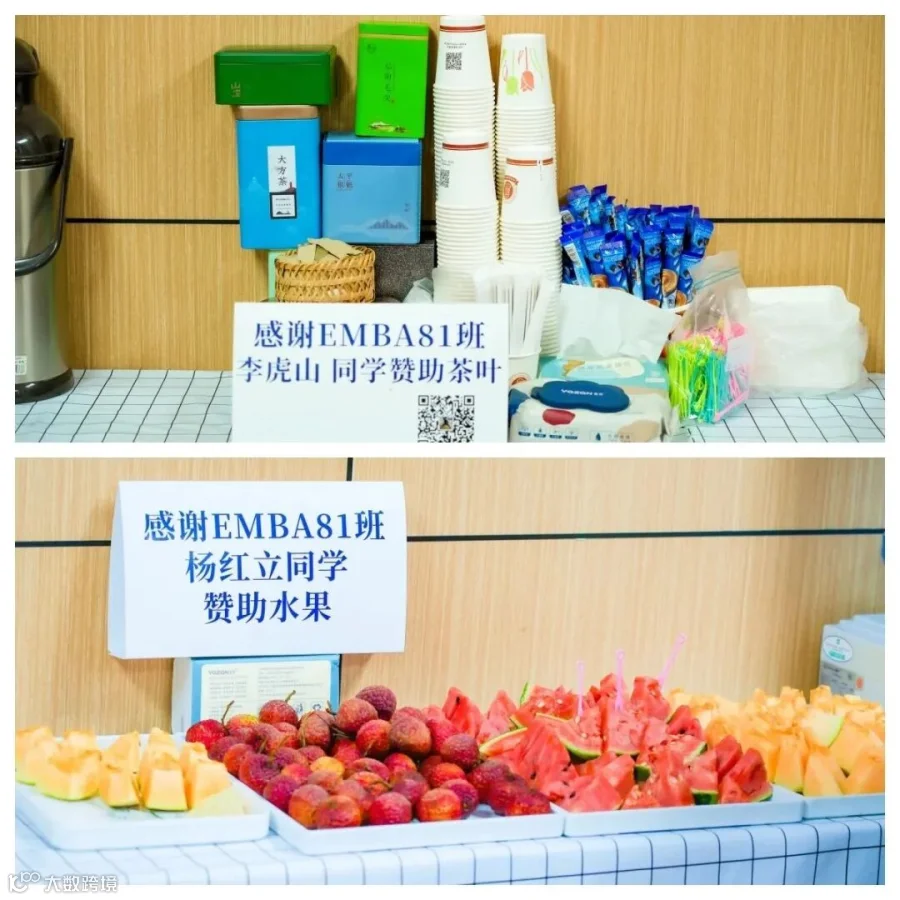课间休息的时候,大家相聊甚欢,也会在茶歇台喝茶吃点心水果。每次都会有同学赞助茶歇。这次赞助茶叶的是李虎山同学,赞助水果的是杨红立同学。非常感谢同学们对班级的热情贡献!