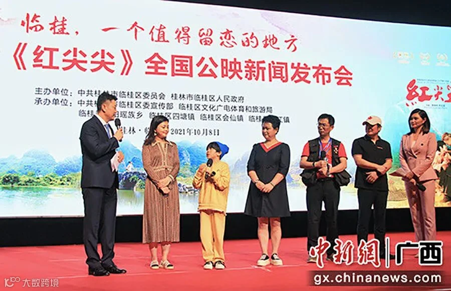 中新网广西新闻10月8日,以桂林市临桂区为主取景地、荣获13项国际奖项的优秀国产影片《红尖尖》公映新闻发布会在桂林大剧院举行。据悉,这部电影将于2021年10月14日在全国各大院线公映,是首部反映中国少数民族教育扶贫故事的儿童电影。