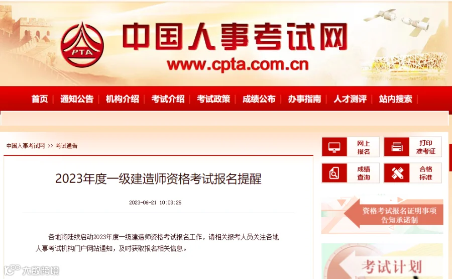 6月21日,中国人事考试网发布《2023年度一级建造师资格考试报名提醒》。