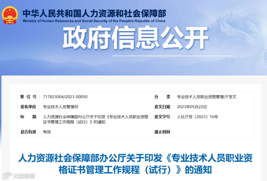 三、人社部印发《专业技术人员职业资格证书管理工作规程(试行)》