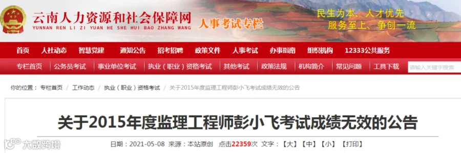 2021年5月,云南省人事考试院发布公告,取消了某考生2015年度监理工程师成绩;