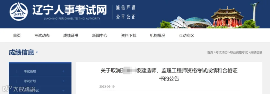 辽宁省人事考试中心发布一则官方通知:一考生因为不符合报名条件,已取得的一建、监理成绩和证书全部取消!