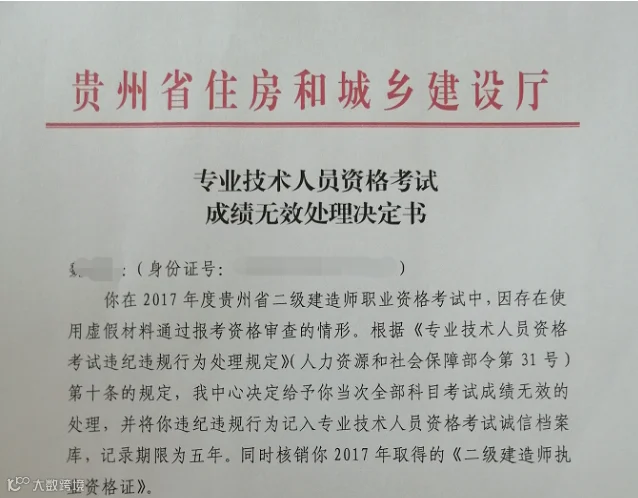 2020年9月,贵州省建设行业职业技能管理中心取消了一名考试2017年的二建成绩。