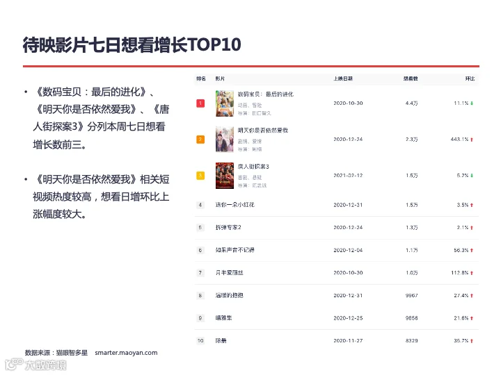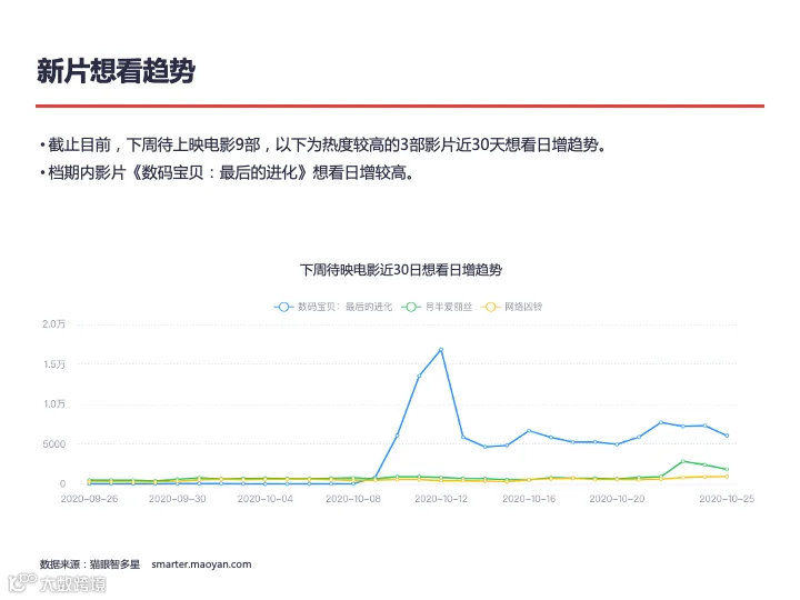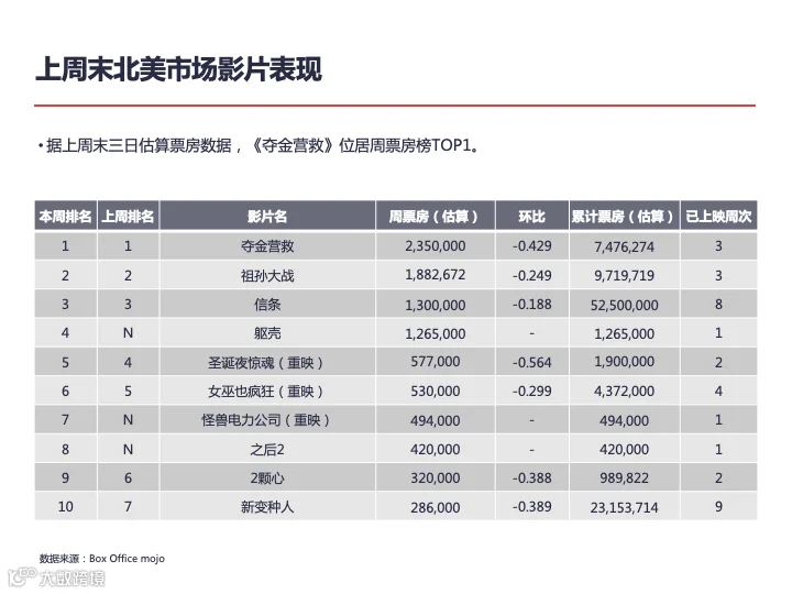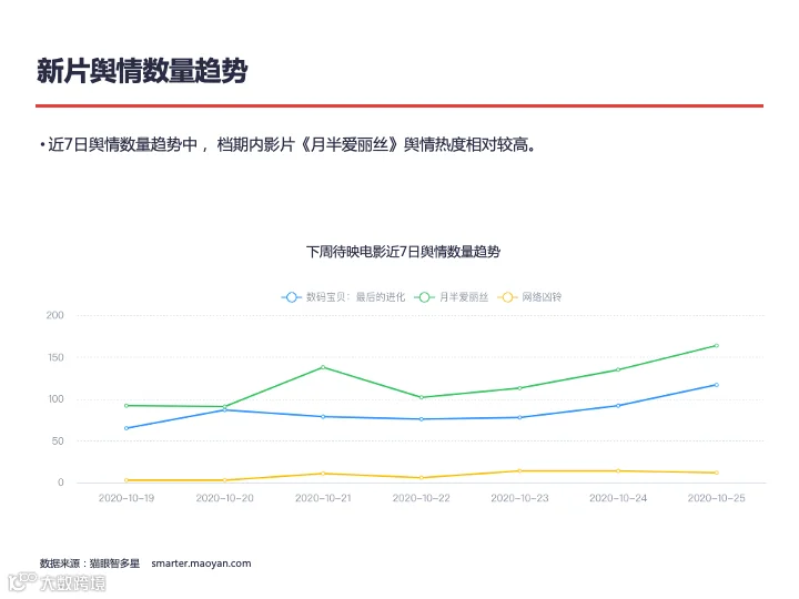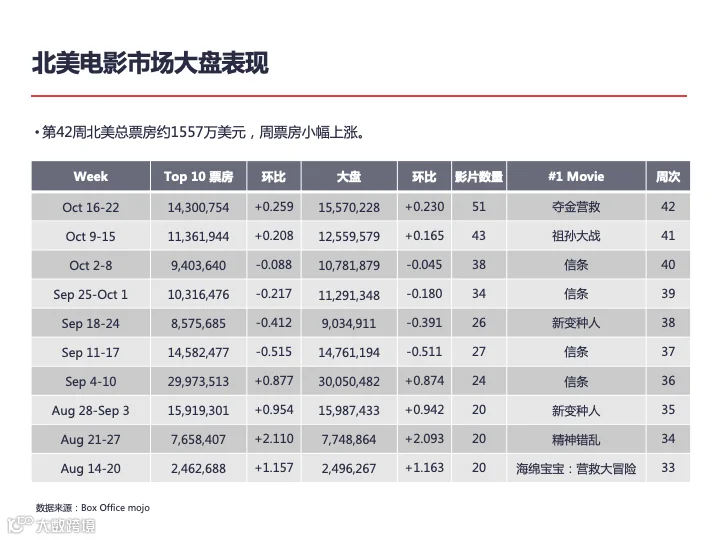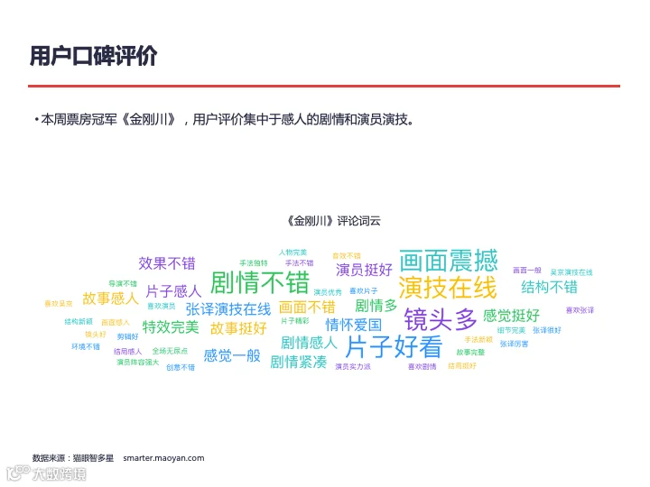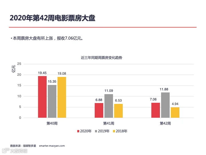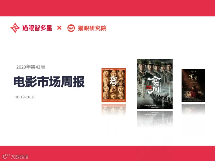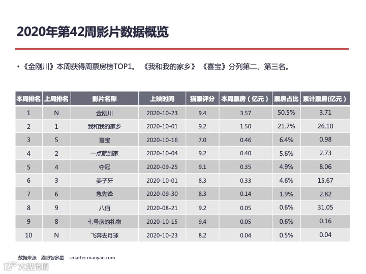 每周内地院线市场综述——2020年第42周(10.19-10.25)全国票房7.06亿(+2.7%),观影人次1892万,放映场次223.2万。《金刚川》首周3.57亿拿下冠军,上映三日连续三天票房破亿。《我和我的家乡》总票房破26亿,升入影史票房前十五名。《喜宝》位居周榜第三,将于本周成为年度第二部票房破亿的爱情电影。