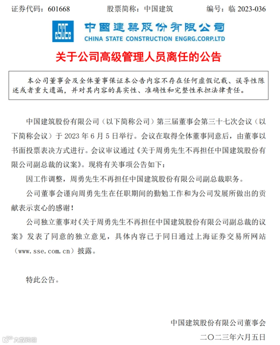 6月5日,中国建筑发布《关于公司高级管理人员离任的公告》,因工作调整,周勇先生不再担任中国建筑股份有限公司副总裁职务。