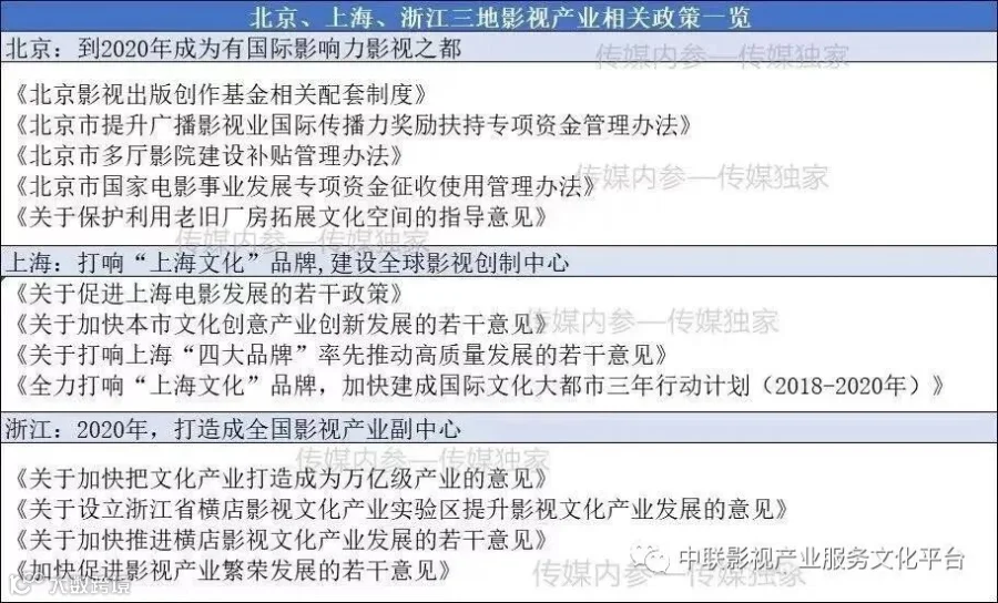 在文化行业大力发展的当下,影视产业的重要性不言而喻。国家先后出台了《电影产业促进法》、《关于支持中西部县城数字影院建设发展的通知》、《关于奖励放映国产影片成绩突出影院的通知》等一批影视政策推动影视行业发展,与此同时,各地陆续出台了相关政策加大影视产业的发展,这其中以北京、上海和浙江最为突出: