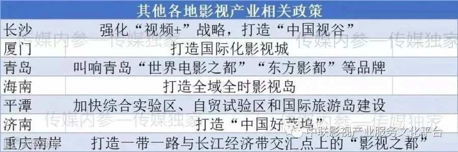 除了横店,近年来,多个城市也努力将自己打造符合自身特色的影视产业重镇,比如,长沙力争打造成中国“视谷”,厦门打造国际化影视城,海南打造全域全时影视岛,青岛打造“东方影都”。
