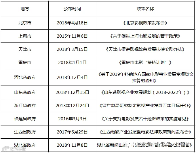 | 福建 | 推进福建省电影产业持续快速发展。 | 充分发挥福建省影视精品奖励资金的引导作用、大力实施县级城市数字影院建设工程、对高新技术的福建电影企业减收企业所得税等。 |