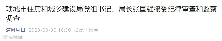 项城市住房和城乡建设局党组书记、局长张国强涉嫌严重违纪违法,目前正在接受纪律审查和监察调查。
