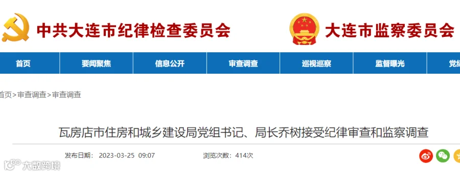 瓦房店市住房和城乡建设局党组书记、局长乔树涉嫌严重违纪违法,目前正接受瓦房店市纪委监委纪律审查和监察调查。