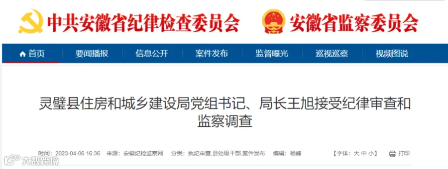 灵璧县住房和城乡建设局党组书记、局长王旭涉嫌严重违纪违法,目前正接受纪律审查和监察调查。(宿州市纪委监委)