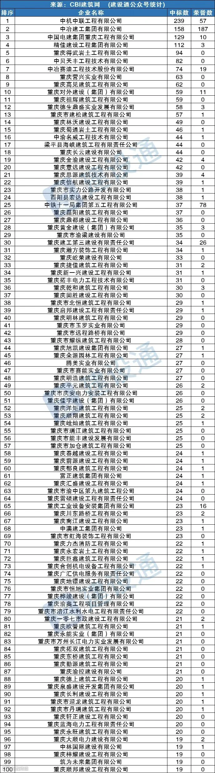 CBI建筑网综合报道:在2022年,重庆建筑施工企业中标数量达29708项,同比(与去年同期)上升82.19%。其中,中机中联工程有限公司、中冶建工集团有限公司、中国电建集团重庆工程有限公司分列中标数量排行榜前三位。