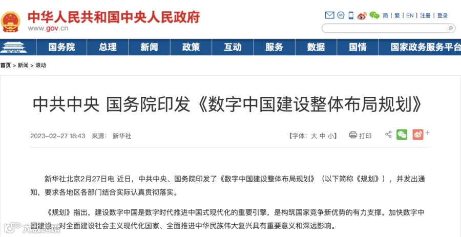 据2月27日报道,中共中央、国务院印发了《数字中国建设整体布局规划》,提出打通数字基础设施大动脉、畅通数据资源大循环等关键举措,为我国新阶段的整体数字经济发展定调。