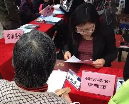 在会场,省消委会工作人员及律师团成员耐心解答群众问题。