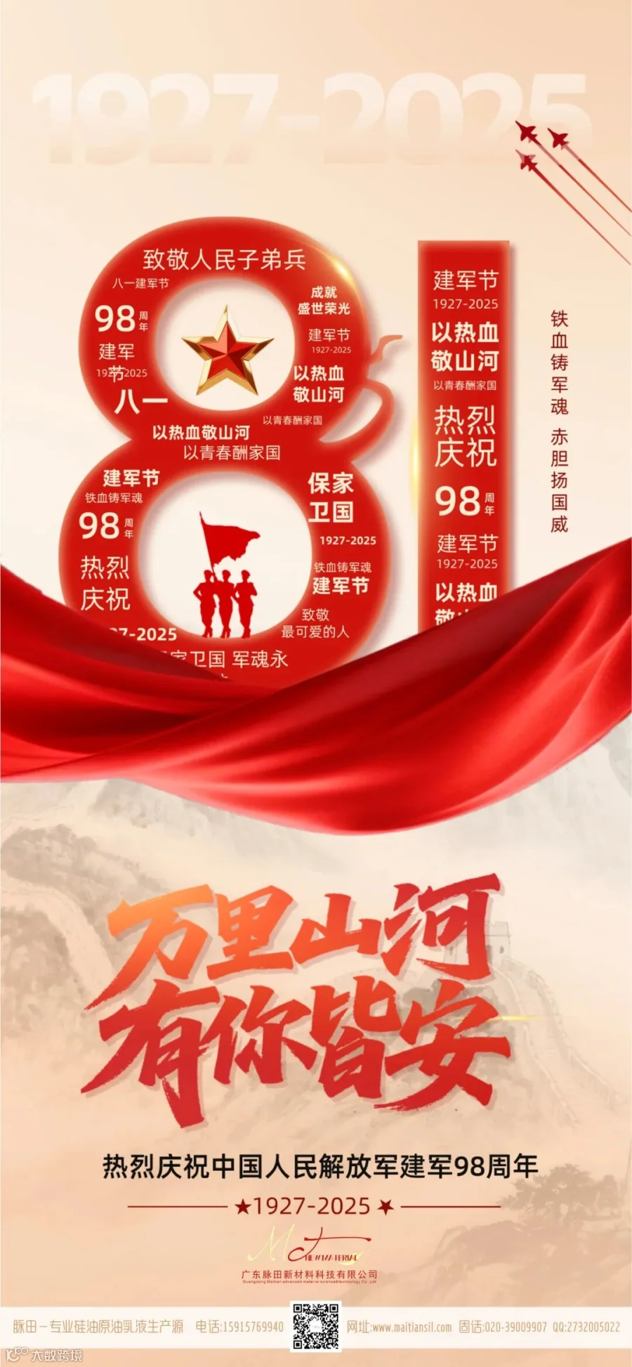 98载峥嵘岁月,你们是保家卫国的钢铁长城,是危难时刻的逆行先锋。感谢你们用忠诚与热血,守护万家灯火,捍卫和平安宁!广东脉田向全体官兵、退役军人及军属致以最崇高的敬意和节日祝福!强国必先强军,军民团结如一人,共筑伟大中国梦!