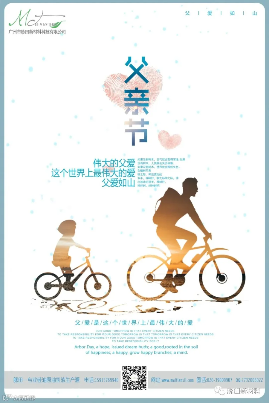 父爱如山,厚重无言。父爱如伞,为你遮风挡雨。恐惧时,父爱是一块踏脚石;黑暗时,父爱是一盏照明的灯;枯竭时,父爱是一湾生命之水;努力时,父爱是精神上的支柱;成功时,父爱又是鼓励与警钟。值此父亲节之际,脉田祝愿每一位父亲,身强体壮,幸福安康!