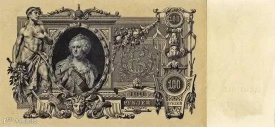 这是一张有着一百多年历史的超大票幅纸币,是俄罗斯末代沙皇尼古拉二世时期发行的卢布之一。把俄罗斯帝国女皇叶卡捷琳娜二世的庄重与华贵表现的淋漓 尽致。该纸币的正面印有“1910”、“国家”、“钞票”、“100卢布”和“国家银行无数量限制兑换钞票和金币”等俄文字样,并附有当年俄罗斯货币发行 部门两名负责人的签名;背面印有俄罗斯帝国女皇叶卡捷琳娜二世的头像,左边是持剑武士,为俄罗斯寓言故事中的人物。