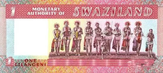 纸币的背面图像主题是王国的芦苇节。芦苇节,又称芦苇舞节,是斯威士兰最为盛大的传统节日。每年8月,斯威士兰都要举行芦苇节,这一节日不仅是庆祝少女成人的盛会,更是国王一年一度的选妃盛典。参加盛会的少女们身着五彩短裙,上身赤裸,手持一束芦苇入场。