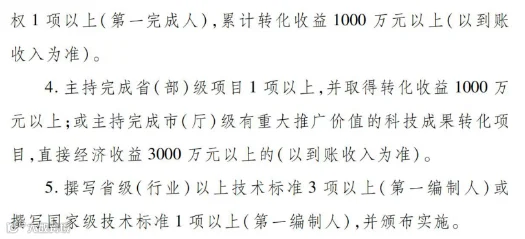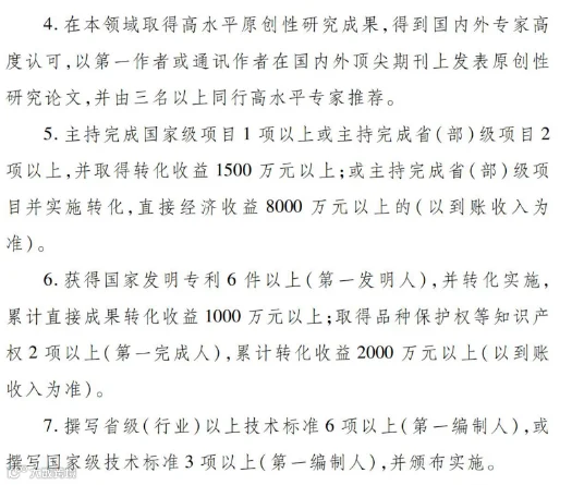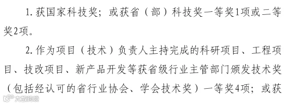 1、作为主要获奖者(排名前3)获得国家科技奖,或获得省(部)级科技奖(排名前3)一等奖,或2项省(部)级科技奖(排名前 3)二等奖。