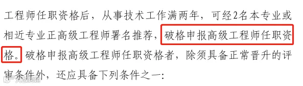 第十七条 不具备规定学历、年限要求,业绩突出、作出重要贡献的,可由2名本专业或相近专业正高级工程师推荐破格申报高级职称。申报高级职称的,一般应取得现职称后,在建设工程专业技术岗位上工作三年以上。