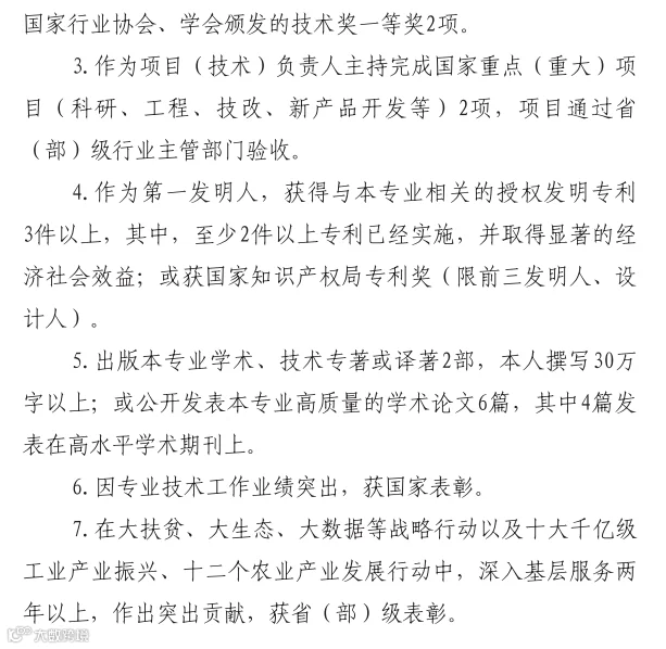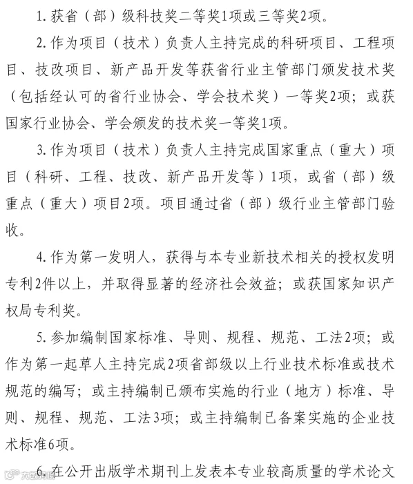 一、破格申报正高级工程师职务任职资格,必须具备下列条件中的第1条,或第2-7条中的2条: