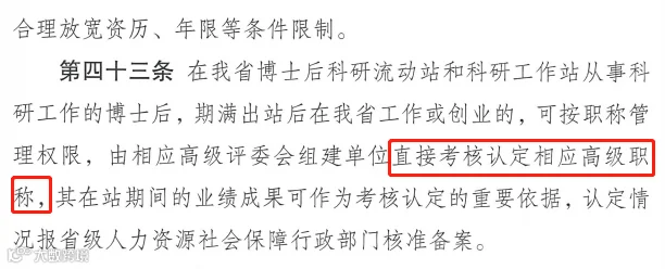 第四十一条 对列入国家和省海外高层次人才引才计划的专业技术人才;博士后科研流动站、工作站出站人员,在站期间能够圆满完成研究课题,并取得科研成果的,可直接确认相应的高级职称。