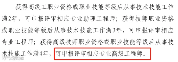 (四)获得高级工职业资格或职业技能等级后从事技术技能工作满2年、获得技师职业资格或职业技能等级后从事技术技能工作满3年、获得高级技师职业资格或职业技能等级后从事技术技能工作满4年,且符合我省相应专业、相应层级职称申报条件中有关工作经历、工作业绩、研究成果等基本条件要求,可分别申报评审(认定)相应专业助理工程师、工程师、高级工程师职称。