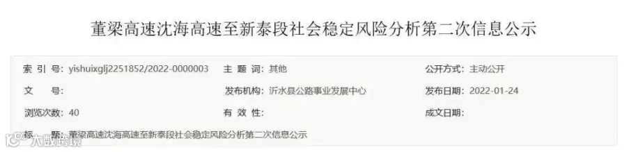 项目最新动态:2022年1月24日,沂水县公路事业发展中心发布董梁高速沈海高速至新泰段社会稳定风险分析第二次信息公示,离开工又近了一步。