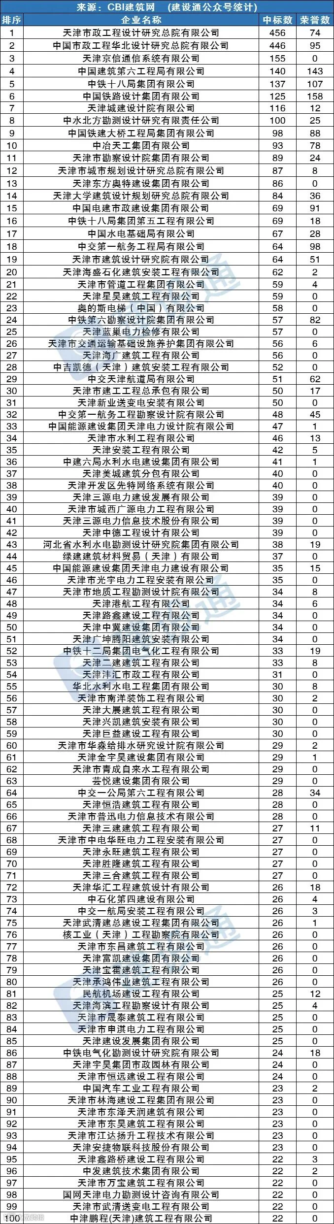 CBI建筑网综合报道:在2021年,天津建筑施工企业中标数量达14296项,同比(与去年同期)上升9.08%。其中,天津市政工程设计研究总院有限公司、中国市政工程华北设计研究总院有限公司、天津京信通信系统有限公司分列中标数量排行榜前三位。