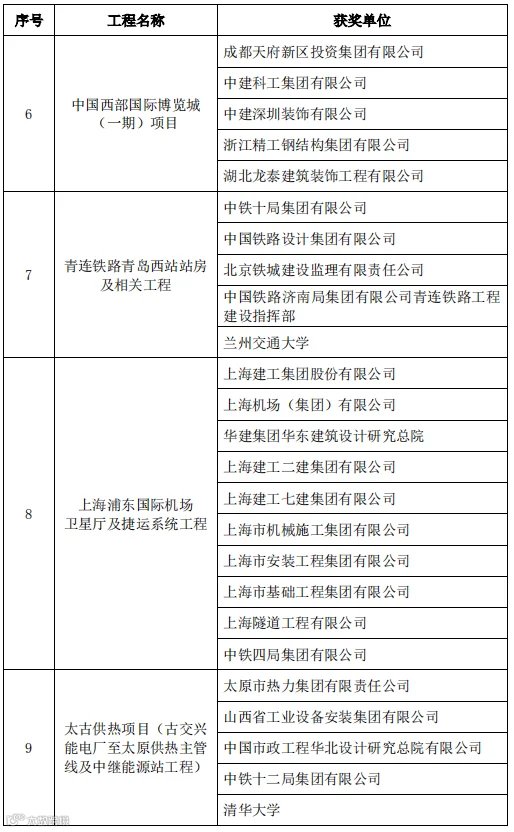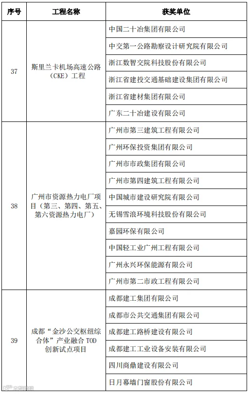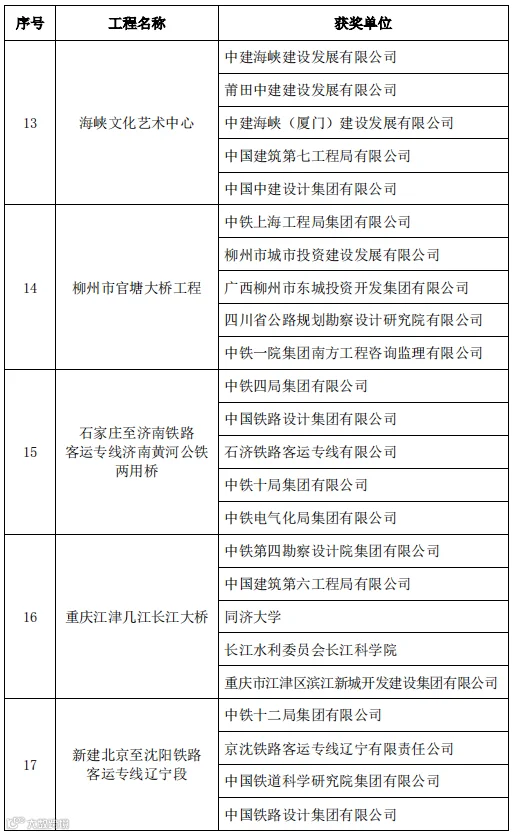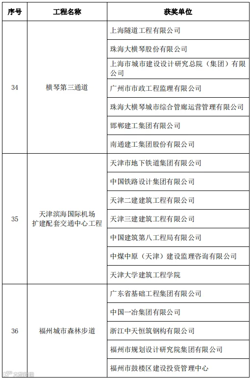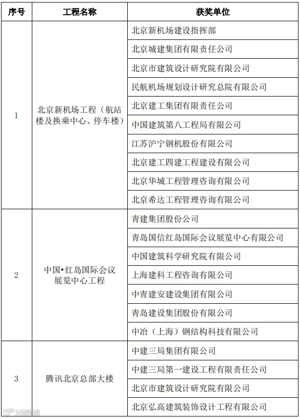 第十九届中国土木工程詹天佑奖经过推荐申报、资格审查、专业组初评、终审会议评审、詹天佑大奖指导委员会审核以及公示等评选程序,共有42项土木工程领域的杰出代表性工程获奖。特此决定对“北京新机场工程(航站楼及换乘中心、停车楼)”等获奖工程及主要承建单位授予中国土木工程詹天佑奖,以资鼓励。