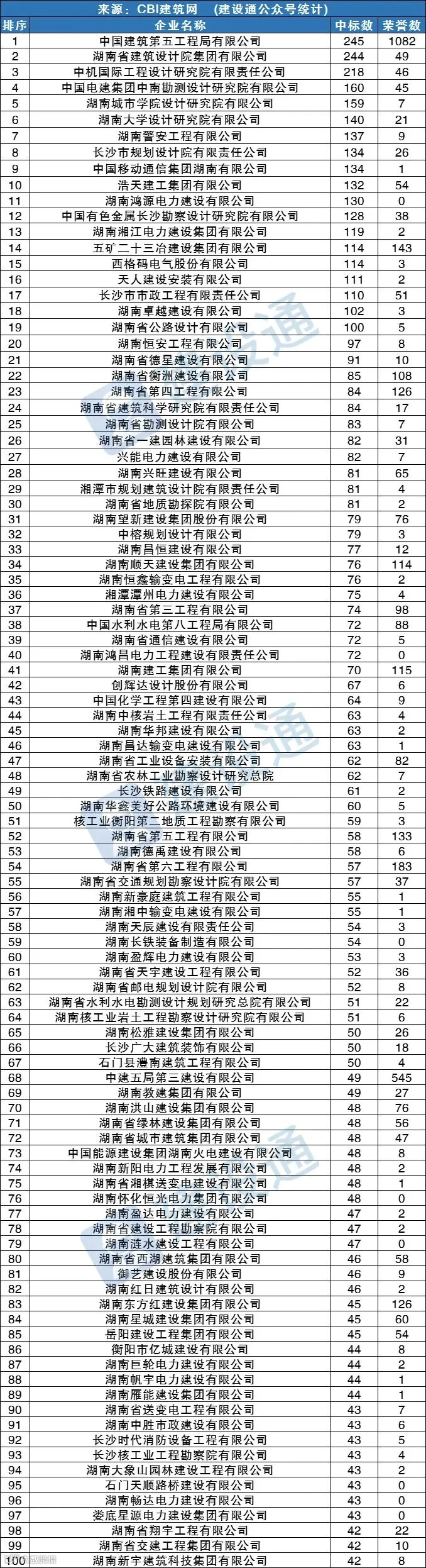 CBI建筑网综合报道:在2021年,湖南建筑施工企业中标数量达32801项,同比(与去年同期)下降1.08%。其中,中国建筑第五工程局有限公司、湖南省建筑设计院集团有限公司、中机国际工程设计研究院有限责任公司分列中标数量排行榜前三位。
