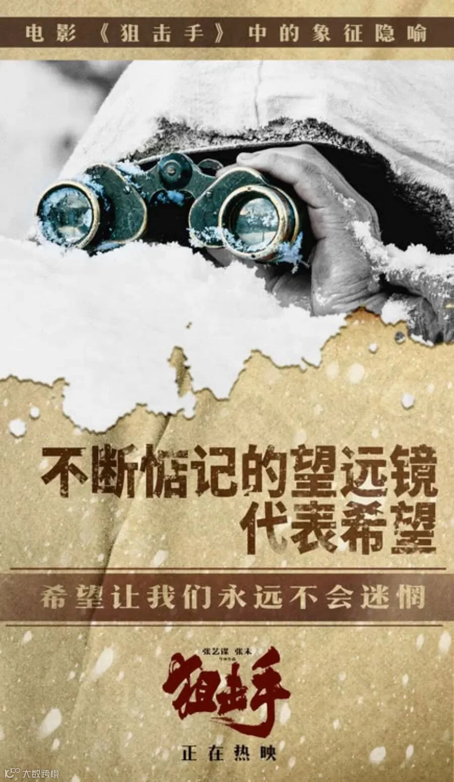 电影《狙击手》自官宣后就备受观众期待,此番也是张艺谋导演首次进军春节档。为更贴近志愿军风貌与展现抗美援朝精神,影片集结金牌制作班底——编剧陈宇、摄影指导赵小丁等幕后工作人员都是多次和张艺谋导演合作的行业翘楚;还有美术指导林木、人物造型指导陈敏正、声音指导杨江和赵楠、动作指导傅小杰及剪辑指导李永等为影片制作保驾护航。为致敬1956年上映我国首部抗美援朝故事片《上甘岭》,电影《狙击手》跨越时空重新演绎我国首部抗美援朝故事片《上甘岭》插曲《我的祖国》经典画面,由林博洋出镜演绎并演唱《狙击手》主题曲《回家》。《我的祖国》是几代人的永恒回忆与精神支柱,深切地表达了浓烈的爱国主义思想,唱出了志愿军战士对祖国、对家乡的无限热爱与思念之情,而“回家”是每个踏上战场的战士最真挚的期盼,也是每个中国人对长眠在异国战场上英烈的缅怀和致敬,期待他们都能早日回家。传承革命精神的同时也赋予了经久不衰的抗美援朝精神全新角度的呈现和寓意。《狙击手》用光影和歌声的艺术向抗美援朝志愿军致敬,向跨越时空传承的伟大抗美援朝精神致敬。