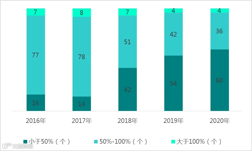 2016-2020年百强县固定资产投资占GDP比重数量分布