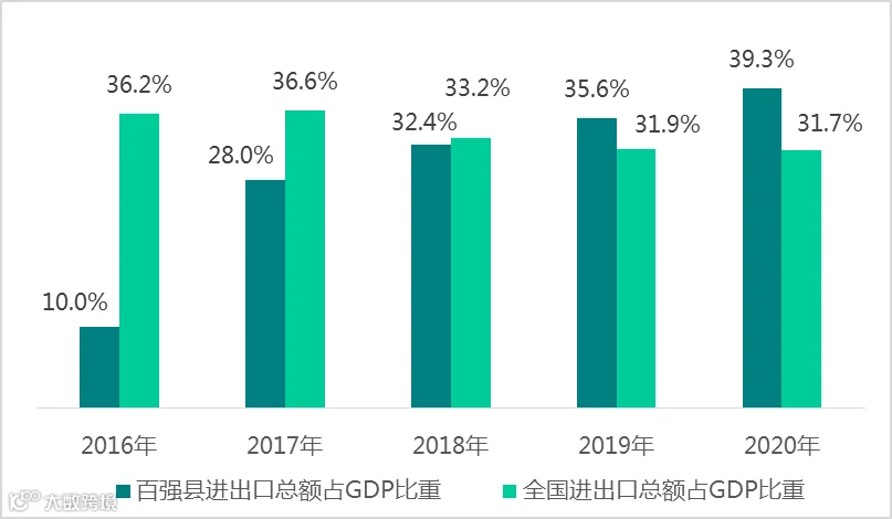 2016-2020年百强县进出口总额占GDP比重变化