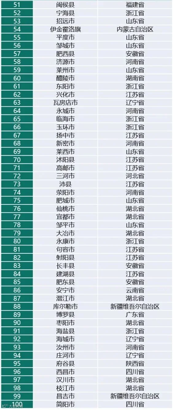 从进步位次数量来看,济源市进步最多,醴陵市和高邮市紧随其后;其中,济源市上升35位,由93位上升至58位;醴陵市次之,上升31位,由91位上升至60位;高邮市上升27位,由98位上升至71位。